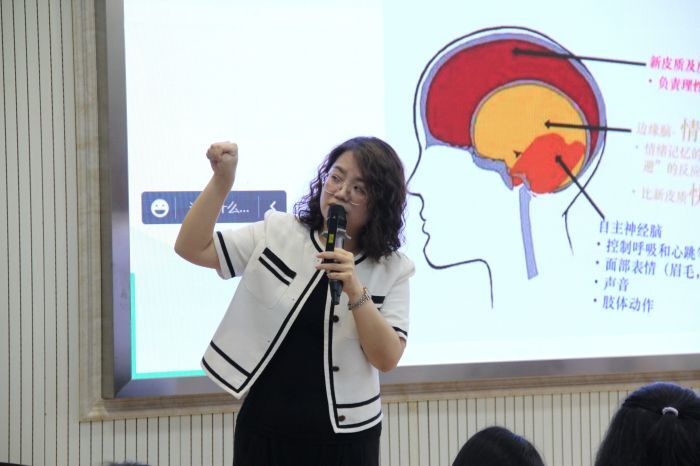 讲座中,在聊到青春期的身心发展变化时,王详君老师首先以“青春期的生理变化”为切入点,通过讲述一系列的青春期身体机能的变化来切入到心理上的改变,通过一项经典的“投射测验”让同学们了解自己在青春期会过度在意自己的缺陷,除此之外她还和同学们分享了关于“外貌焦虑”的看法,并教授同学们如何解决青春期身体和心理双成长的矛盾带来的问题。