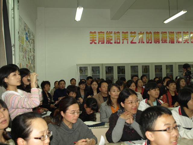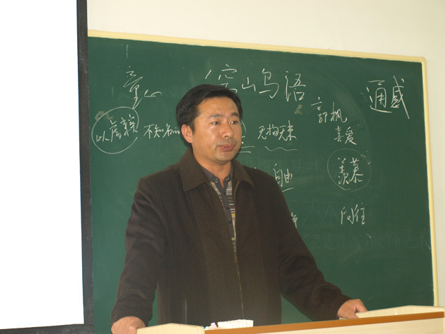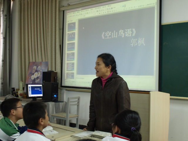 下午2点,参加“国培计划2011”的陕西省初中语文教师参访团一行50余人在我校科技楼多媒体教室听取了语文教研组组长喻中胜老师的一堂公开课-《空山鸟语》。