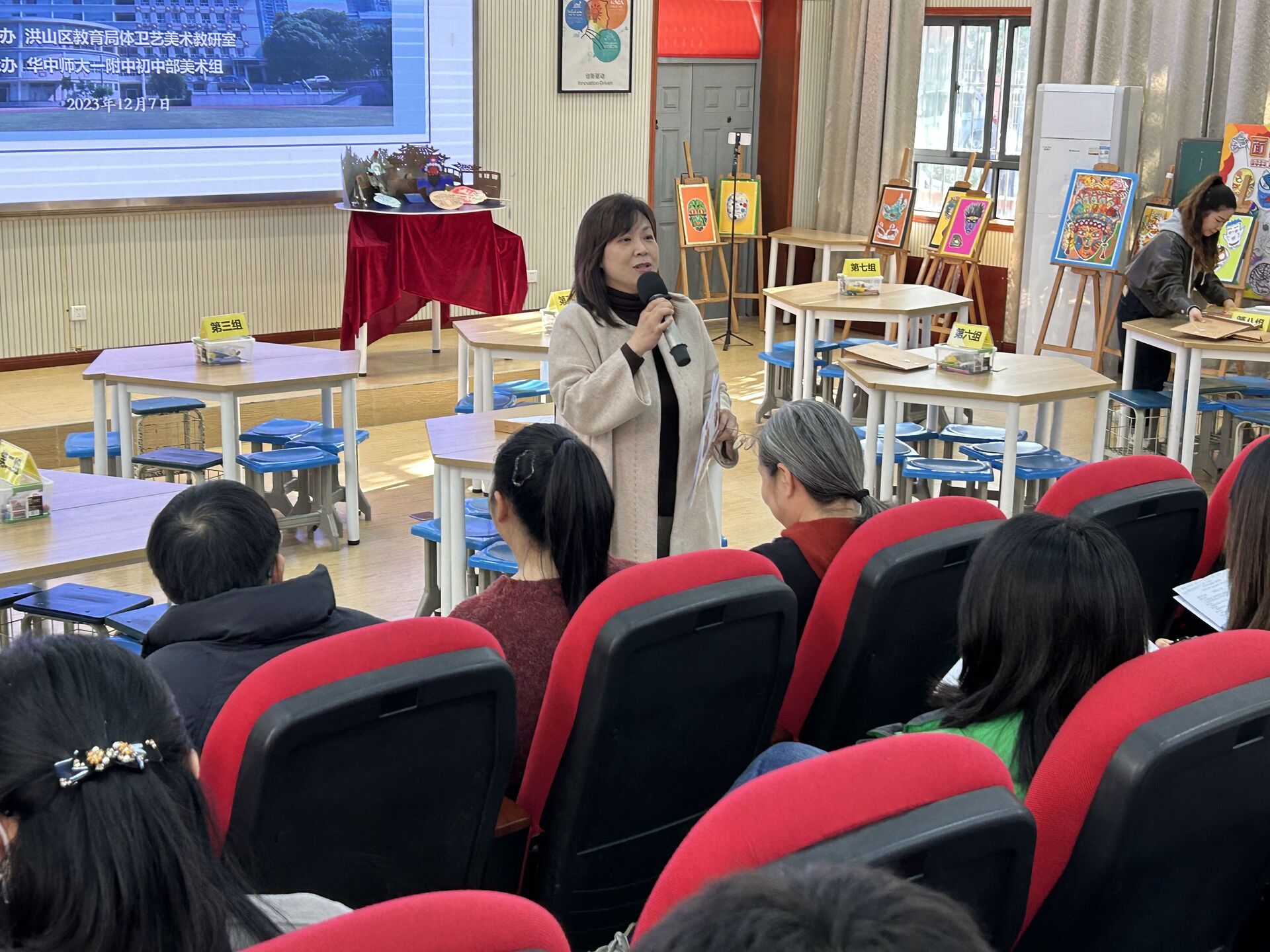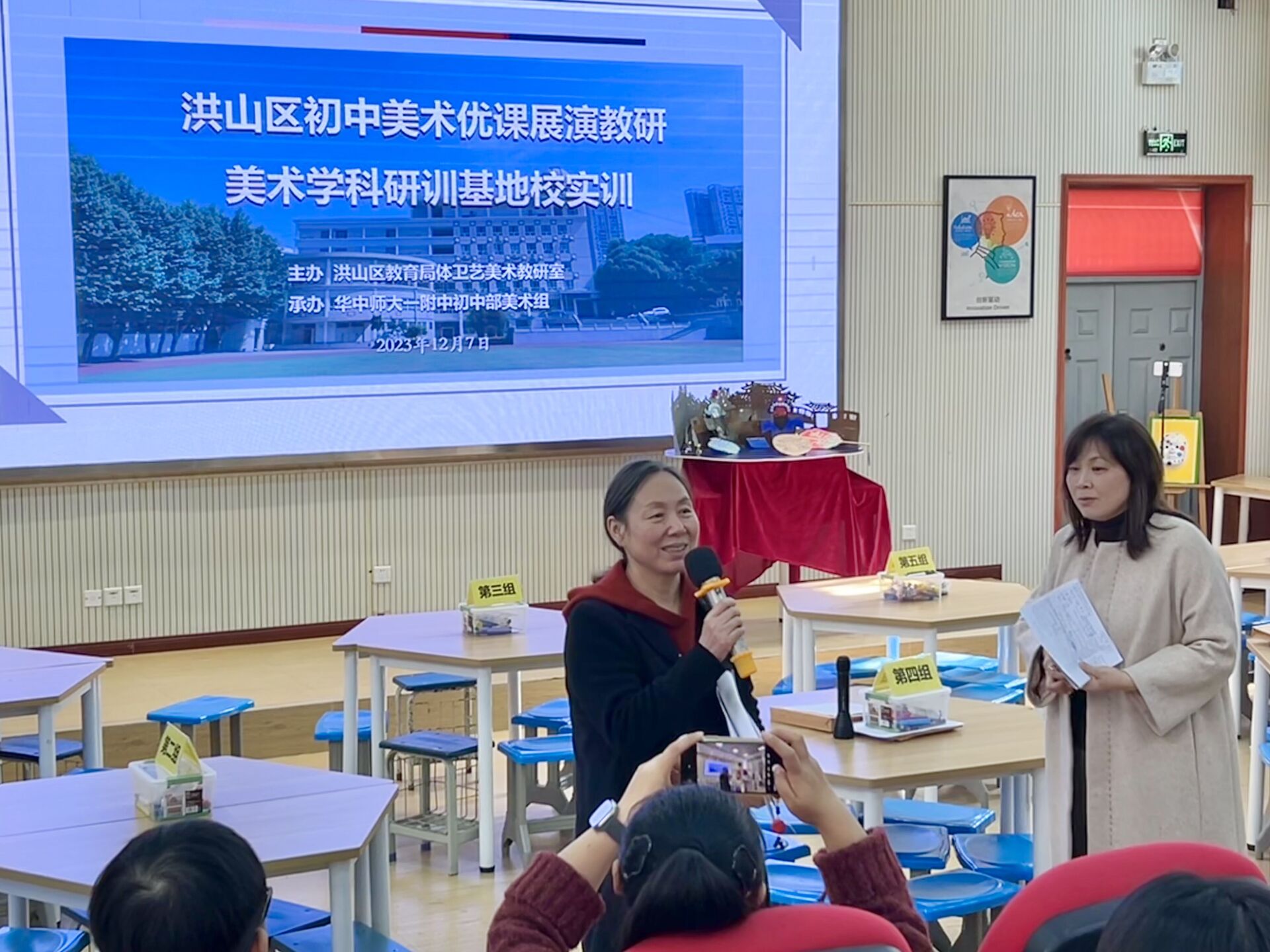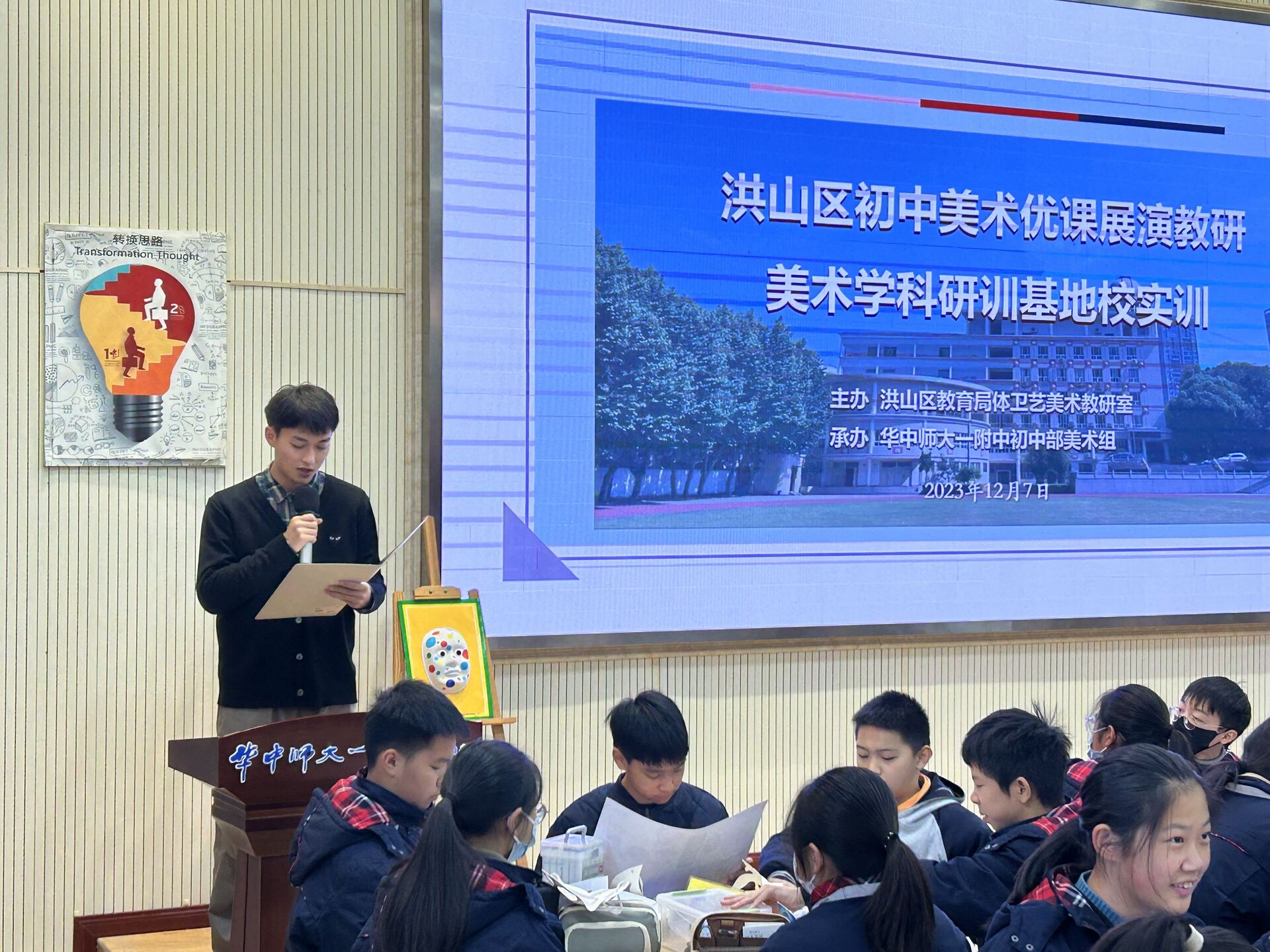 12月7日,洪山区初中美术优课展演教研、洪山区美术学科研训基地校实训活动在华中师大—附中初中部顺利开展。活动邀请了洪山区教育局体卫艺美术指导室美术教研员牟朵、华中师范大学美术学院高细媛教授、华中师范大学第一附属中学美术教师戈芳老师以及洪山区中学美术教师、洪山区美术基地校成员观摩指导,华中师范大学美术学院部分研究生以及黄冈师范学院美术学院的部分研究生参加活动。华中师大一附中初中部多位领导参与了活动,活动由华中师范大学附属小学的美术教师涂明天主持。