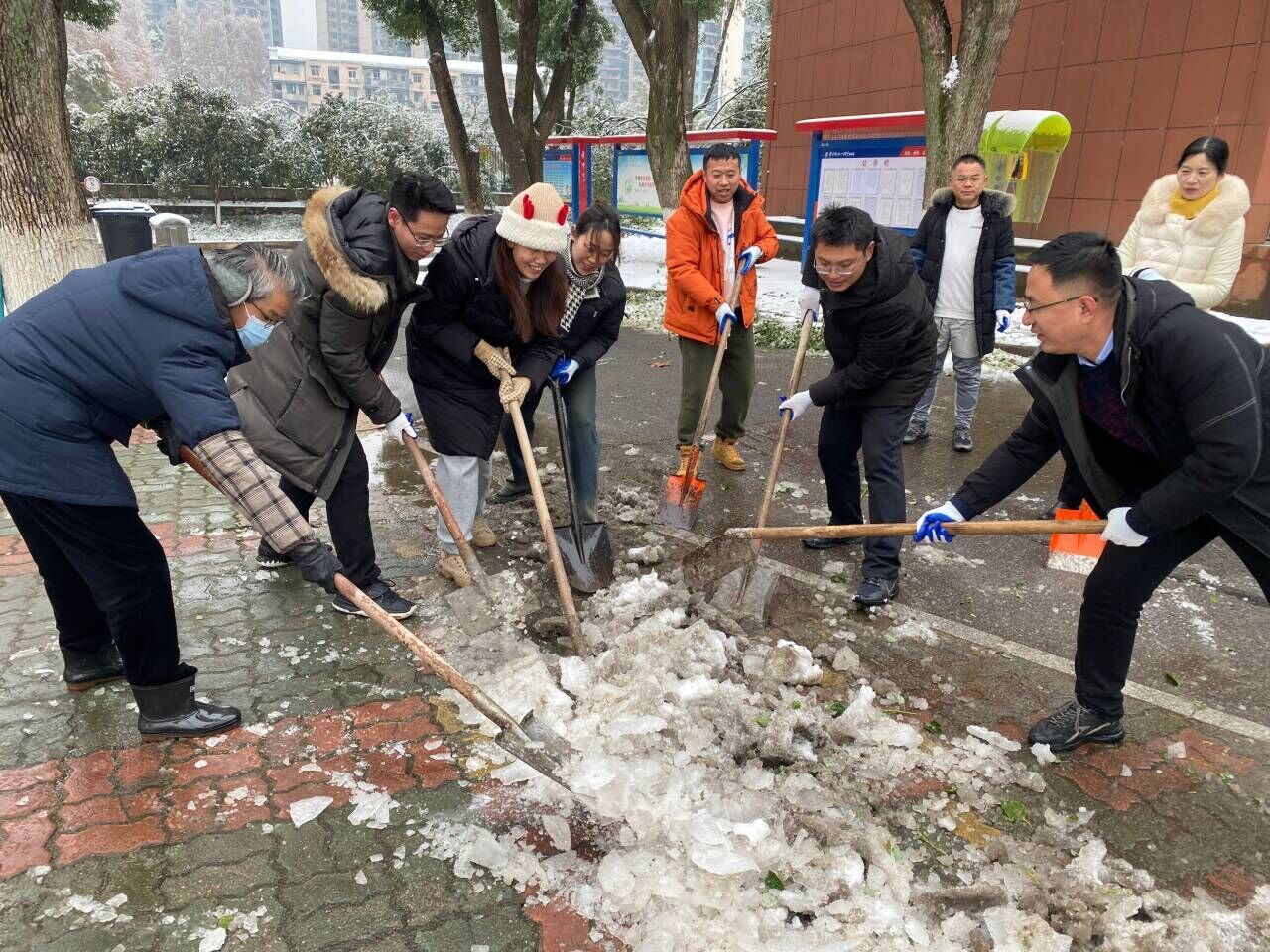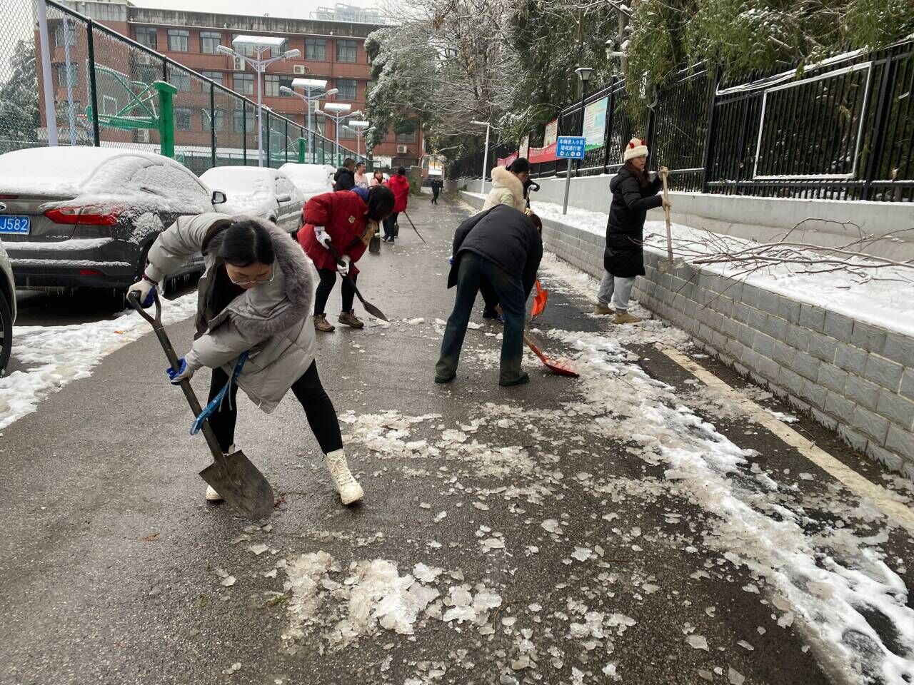 下午2:30,由17名教师组成的志愿队不畏严寒、克服困难,拿起扫帚和铁锹,全身心投入到除雪铲冰中去。经过两个多小时热火朝天的奋战,校园和家属区主干道、停车场、教工宿舍出入口等重点区域基本畅通无阻,及时为家属区居民群众开辟出了一条“安全路”。