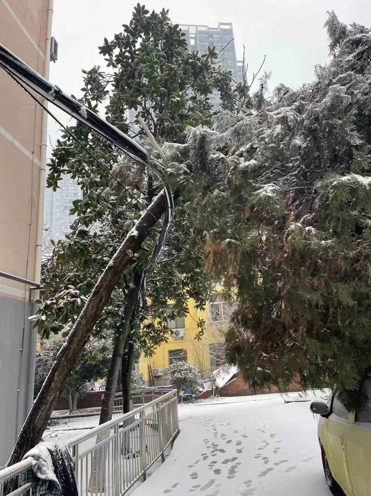 2月4日,华师一附中初中部校园多处路面结冰打滑,樟树等树木树枝“不堪重负”。学校也在时刻关注家属区离退休老教师情况。当天上午,学校家属区一条10KV高压线因树枝摩擦和冰凌造成短路起火断成两截,情况万分火急,家属区住户的安全与能源供应问题迫在眉睫。
