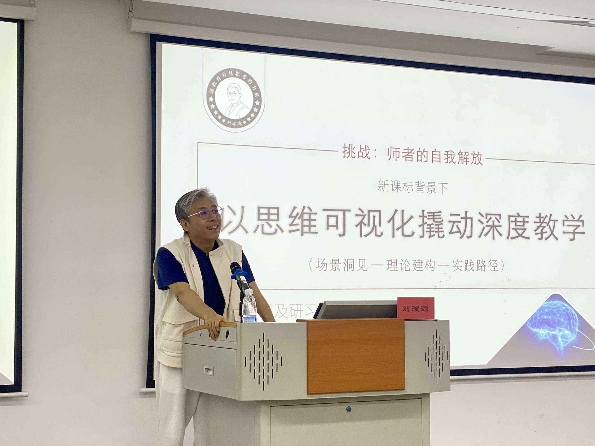 首场专家讲座的题目是《运用思维可视化撬动深度教学》。主讲专家刘濯源教授是南京心智文化发展研究院院长、思维可视化教学体系创始人、素养发展型课程与教学实现体系创建者。给我们带来了一场探究深度教学的视听盛宴。刘教授从心理学的专业角度,融合跨学科技能,通过大量形象有趣的案例,基于培养完整的人的高站位、大格局,提出“心”“智”“识”“技”“场”五个纬度的素养构成要素。打通我们日常思维的壁垒,为我们培养创造型人才指明了路径。