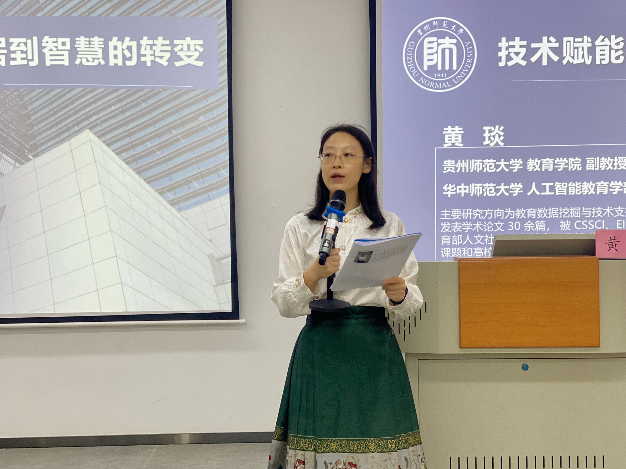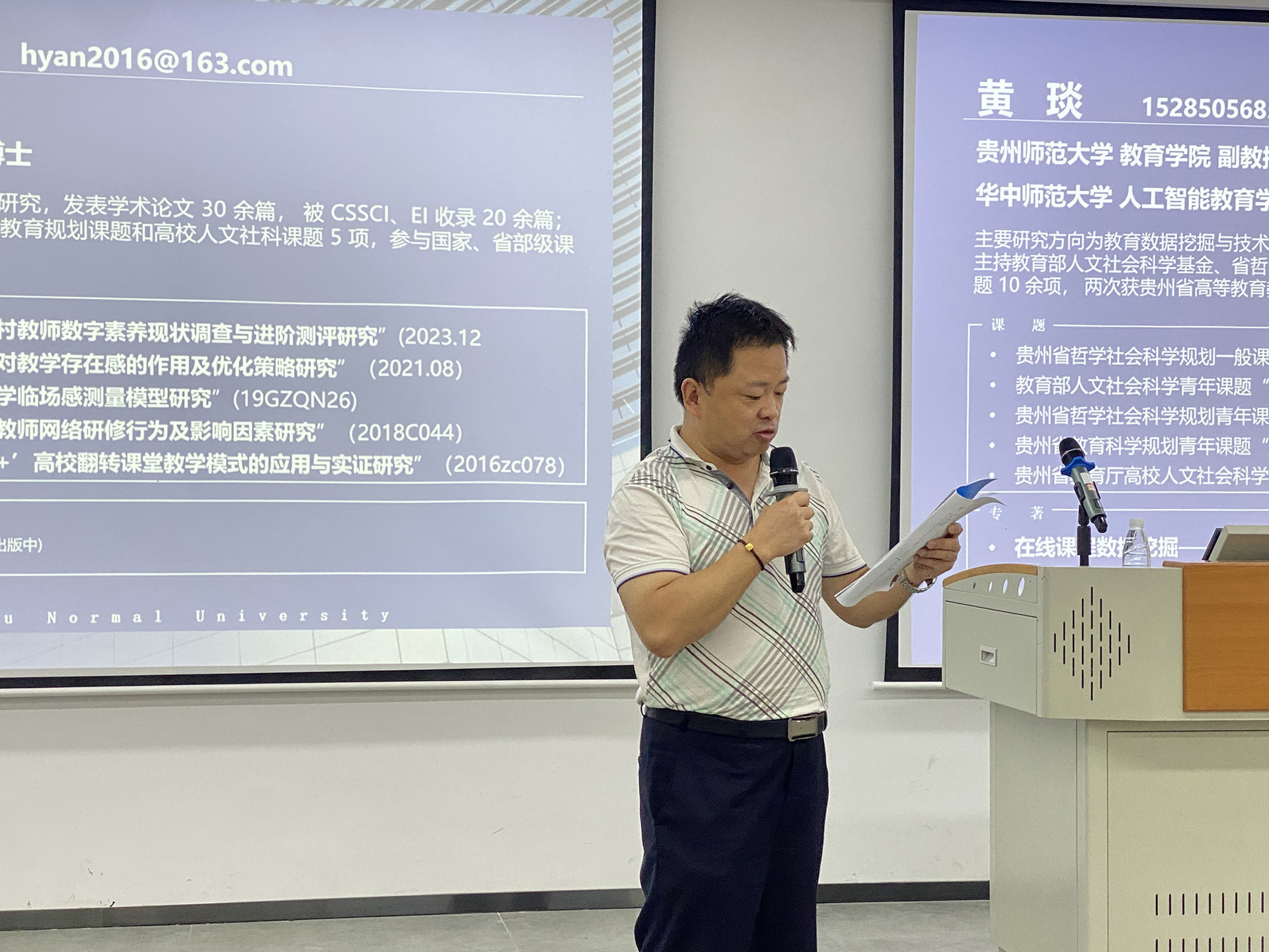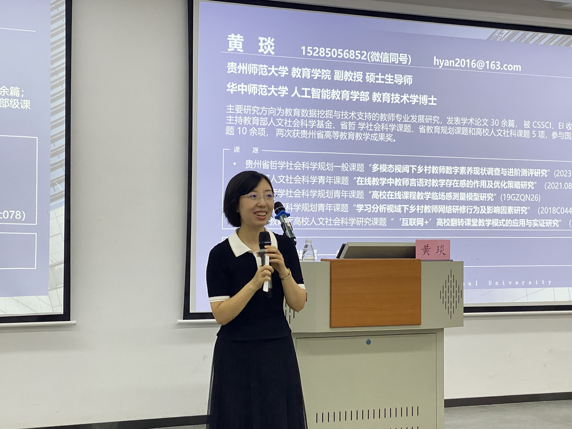 下午的报告《技术赋能教育:从数据到智慧的转变》由贵州师范大学硕士生导师黄琰主讲。黄教授通过大数据在各领域尤其是在教育领域的应用,为我们提供了一个紧跟时代潮流的全新视角。“寻找学霸”“慕课学习”等生动案例的数据调查启发我们将其方法迁移到我们的日常教育教学中——通过设计数据分析的纬度加强对学生的学情观察以便于更好的因材施教。
