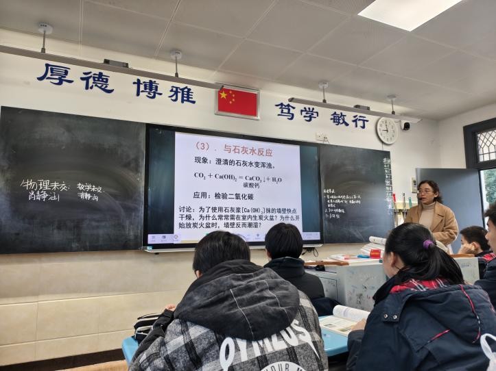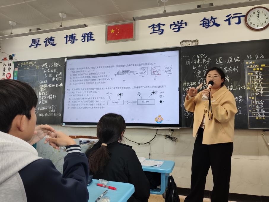 华师龙园附校蔡丹容老师:在学情把握上,赵老师展现出极强的教学功底。他通过课前提问、作业批改等方式精准定位学生薄弱环节,针对性开展专项习题讲解。针对微观变化理解困难的问题,他借助模型演示将抽象概念具象化;对于化学方程式计算和化学式推算中的易错点,他进行分层剖析练习题,学生都能在练习中巩固提升,掌握解题关键。这种层层递进地教学方式,极大提高了课堂教学效率,也让我深刻认识到,只有精准掌握学情,才能实现有效教学。