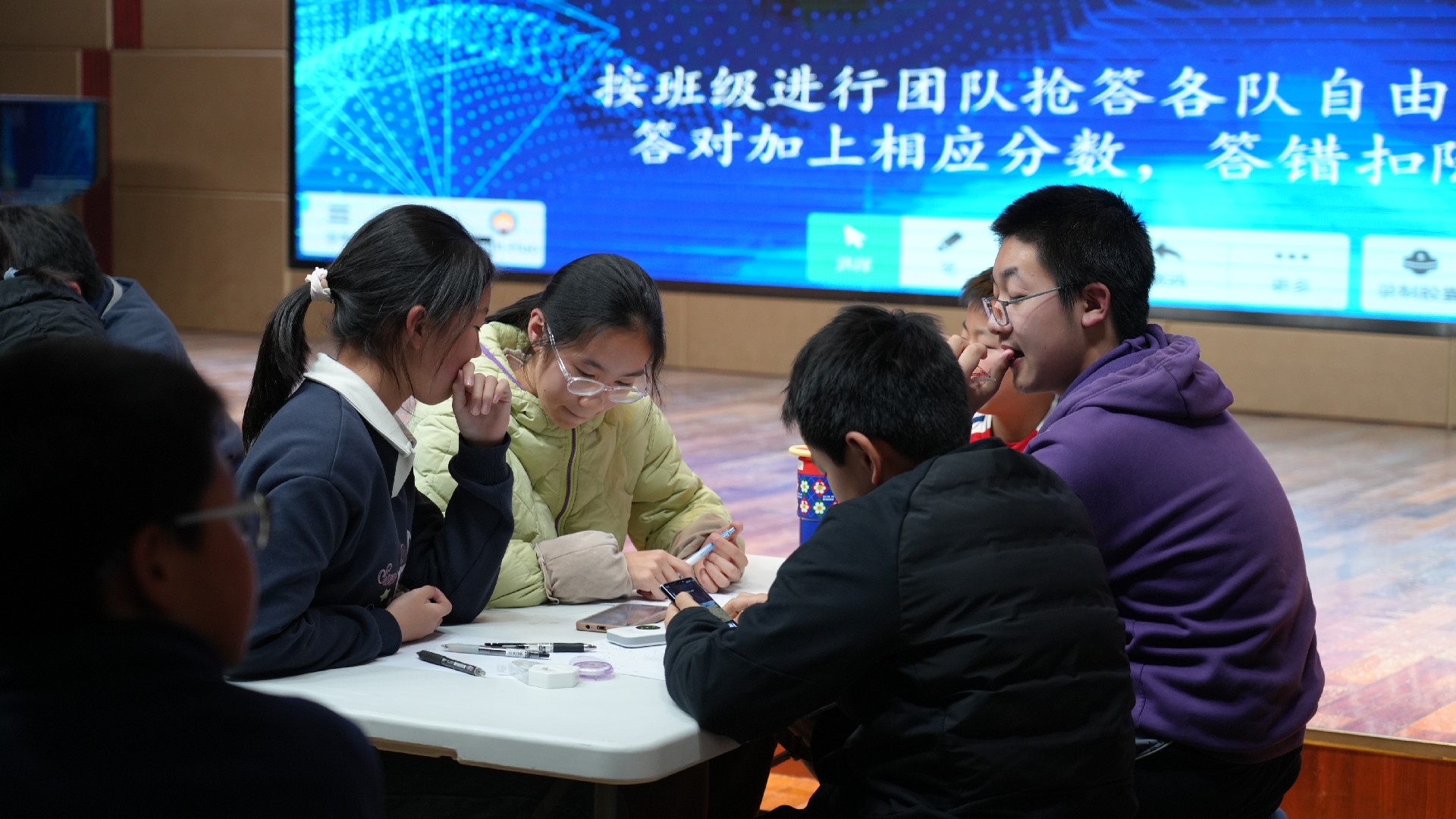 “争分夺秒”团队抢答题环节,抢答器的清脆声响划破现场,各战队紧盯题目、快速研判,队员间眼神交汇、默契配合,在紧张角逐中展现着思维的敏捷与协作的力量;