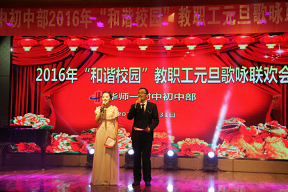 ——华师一附中初中部2016年“和谐校园”教职工元旦歌咏联欢会隆重举行2015年12月31日下午3点整,华师一附中初中部2016年“和谐校园”教职工元旦歌咏联欢会在学校演播厅隆重举行。全校教职员工及部分家属代表出席了本次大会。担任本次联欢会主持的是章文太老师和王丹老师。担任评委的是谌国芳···