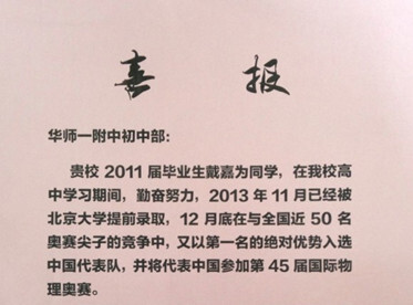 喜报:我校2011届毕业生将戴嘉为代表中国参加国际物理奥赛并被北大提前录取